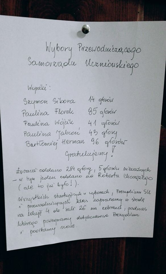 UWAGA! Wybory na przewodniczącego szkoły w roku 2016/2017 wygrał Bartłomiej Herman! Gratulujemy zwycięzcy i życzymy sukcesów. 🙂 Informujemy, że zebranie nowego samorządu odbędzie się w środę 15590455_720266564809333_8347497951952573747_n 15665555_720267064809283_340015801988691751_n(21.12.16) na lekcji 4 w sali 26. 🙂