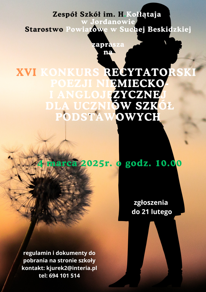 W dniu 22 marca 2019r. w Zespole Szkół im. H. Kołłątaja w Jordanowie odbył się X Konkurs Recytatorski Poezji Niemiecko- i Anglojęzycznej dla Uczniów Szkół Gimnazjalnych i Podstawowych. Do konkursu przystąpiło 66 uczestników (30- j. niemiecki, 36 – j. angielski) z 16 szkół: z Toporzyska, Naprawy, Grzechyni, Białki, Makowa Podhalańskiego, Chabówki, Łętowni, Krzczonowa, Żarnówki, Rdzawki, Skawy, Skomielnej Białej, Rokicin Podhalańskich, Sidziny i Spytkowic.