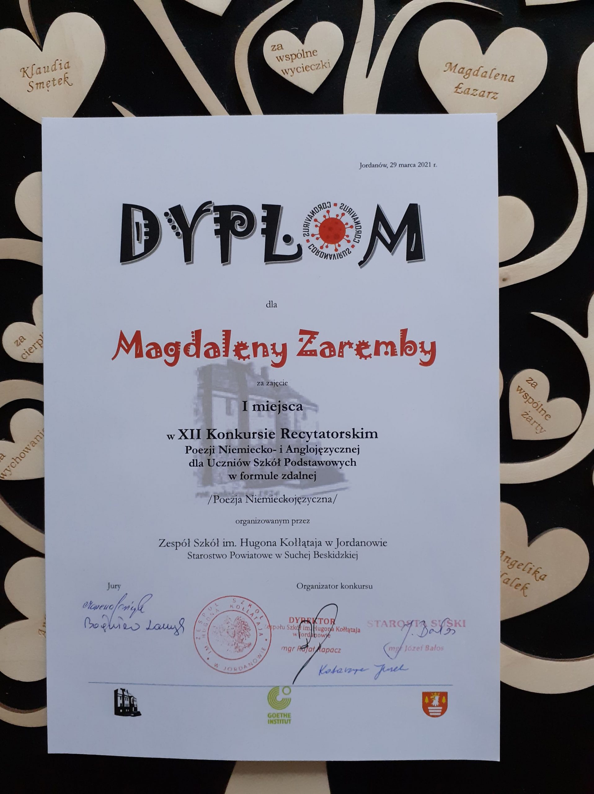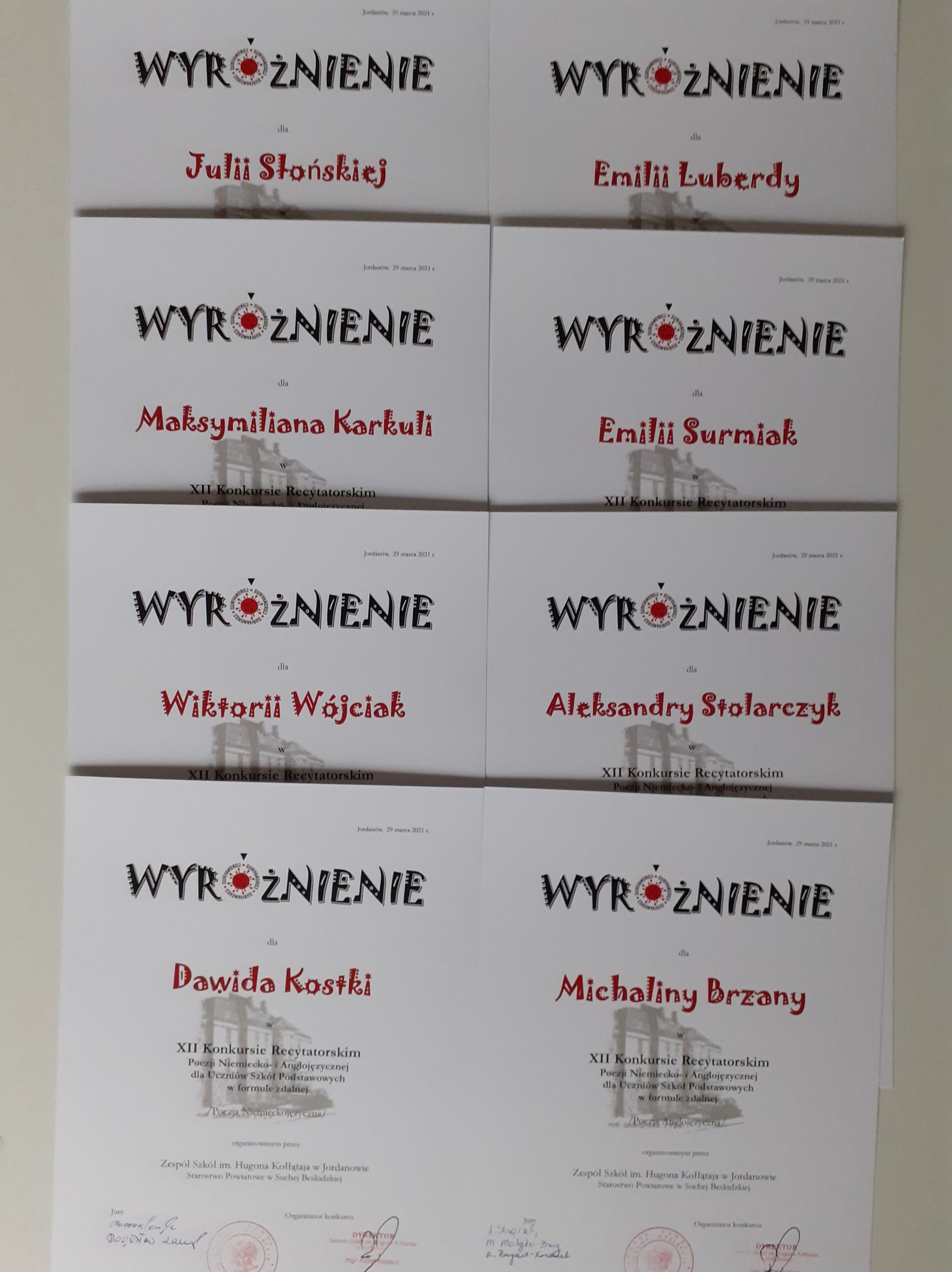 W dniu 29 marca 2021r. został rozstrzygnięty XII Konkurs Recytatorski Poezji Niemiecko- i Anglojęzycznej dla Uczniów Szkół Podstawowych w formule zdalnej. Konkurs jest współorganizowany przez Starostwa Powiatowego w Suchej Beskidzkiej, które jest fundatorem nagród. Nadesłano 51 recytacji (23 – j. niemiecki, 28 – j. angielski) uczniów z klas 6, 7 i 8 z 16 szkół podstawowych z: Jordanowa, Juszczyna Toporzyska, Spytkowic, Naprawy, Krzczonowa, Grzechyni, Sidziny, Chabówki, Bystrej Podhalańskiej, Rabki Zdroju (2 szkoły) Rdzawki, Skawy, Żywca, Wysokiej.
