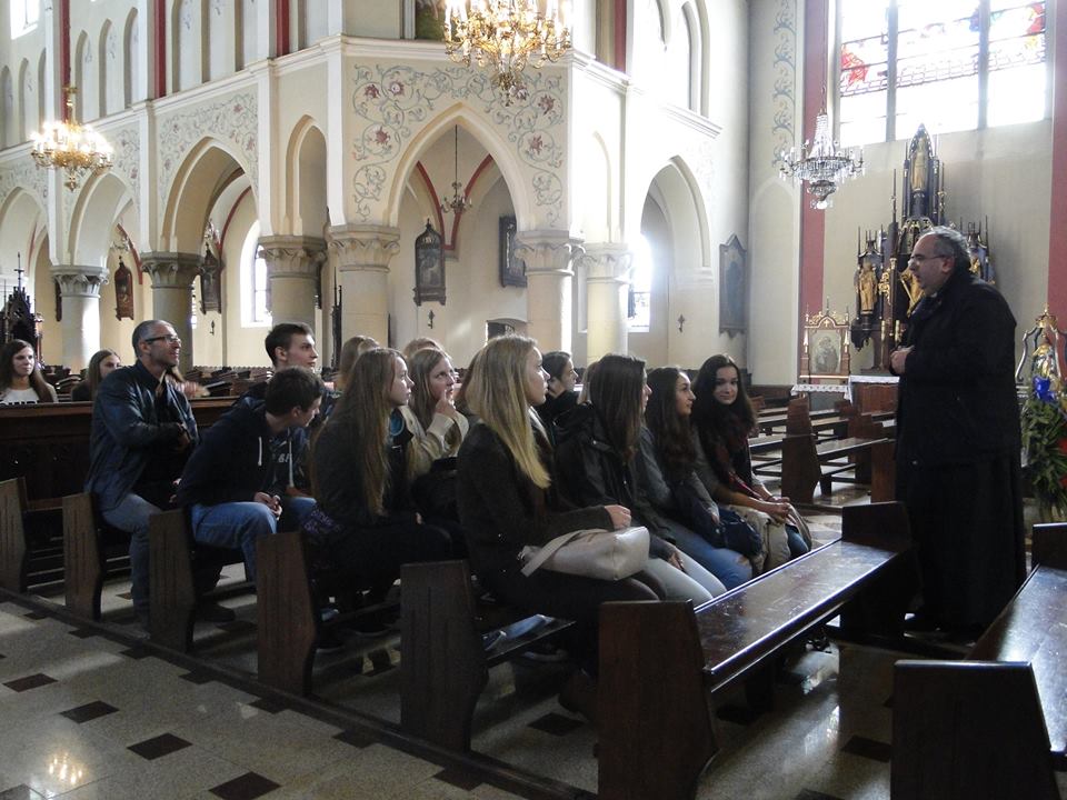 Po zajęciach w szkole – na zaproszenie proboszcza parafii ks. Pawła Guni – udaliśmy się do kościoła parafialnego. Proboszcz parafii przedstawił nam w języku niemieckim historię Kościoła Przenajświętszej Trójcy oraz obrazu Matki Bożej Trudnego Zawierzenia.