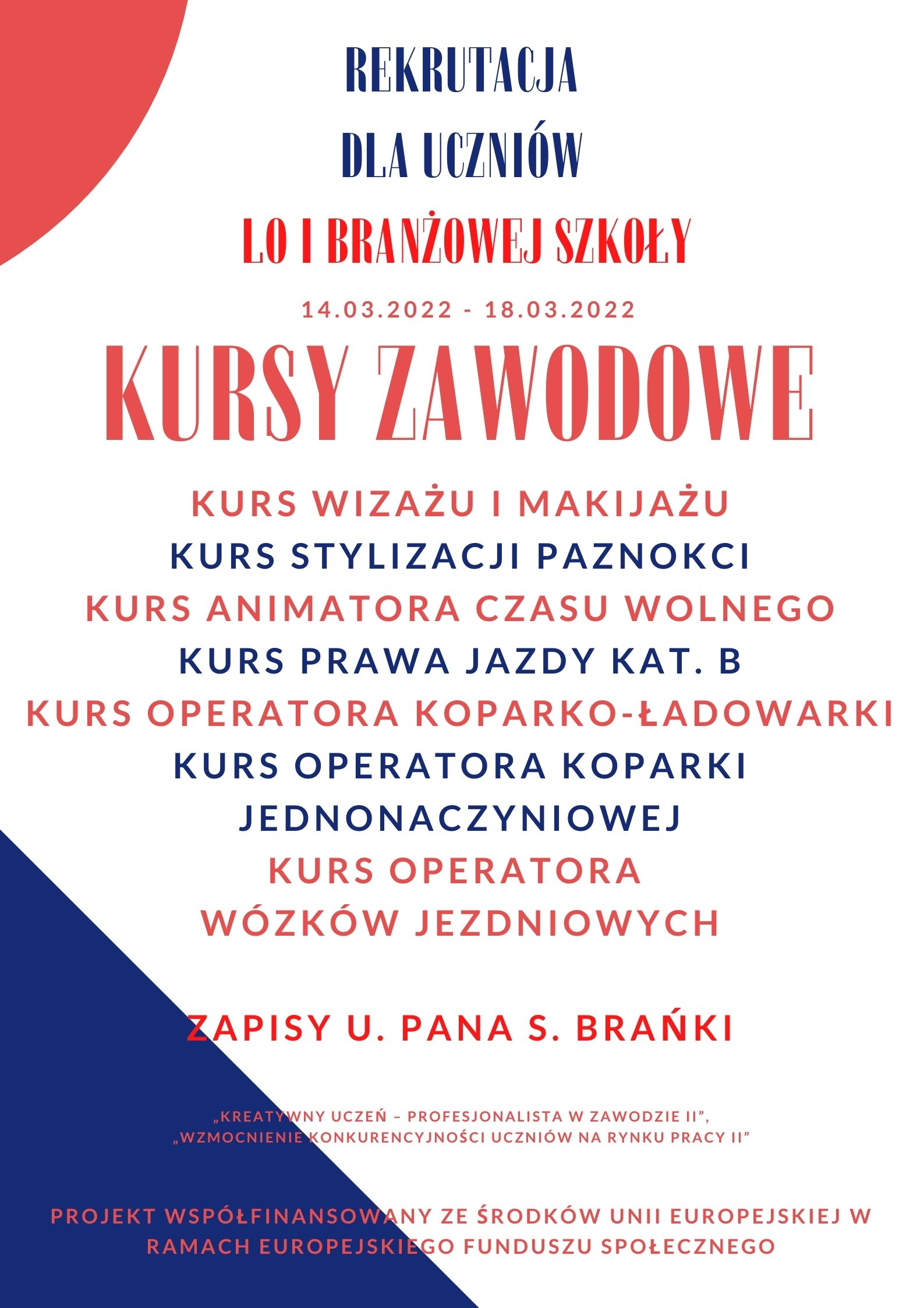 realizowanych w ramach projektu: „Kreatywny uczeń – profesjonalista w zawodzie II”, „Wzmocnienie konkurencyjności uczniów na rynku pracy II” Projekt współfinansowany ze środków Unii Europejskiej w ramach Europejskiego Funduszu Społecznego Uczniów zainteresowanych udziałem w w/w kursach prosimy o złożenie dokumentów rekrutacyjnych w powyższym terminie u Lidera Szkolnego: p. Sławomira Brańki Informujemy, że dokumentacja rekrutacyjna zgodnie z zapisami Regulaminu rekrutacji dostępna jest na stronach internetowych szkół realizujących projekt, oraz na tablicach ogłoszeń, a także w Biurze Projektu w Wydziale Edukacji Starostwa Powiatowego w Suchej Beskidzkiej, ul. Kościelna 5b, 34 – 200 Sucha Beskidzka