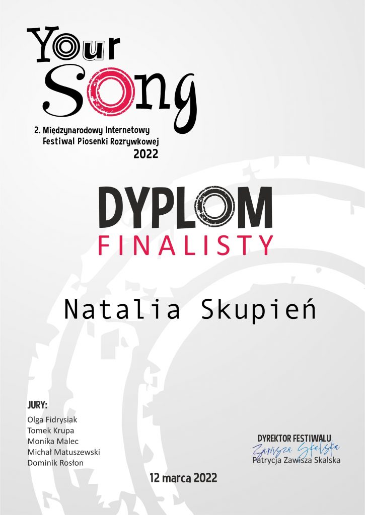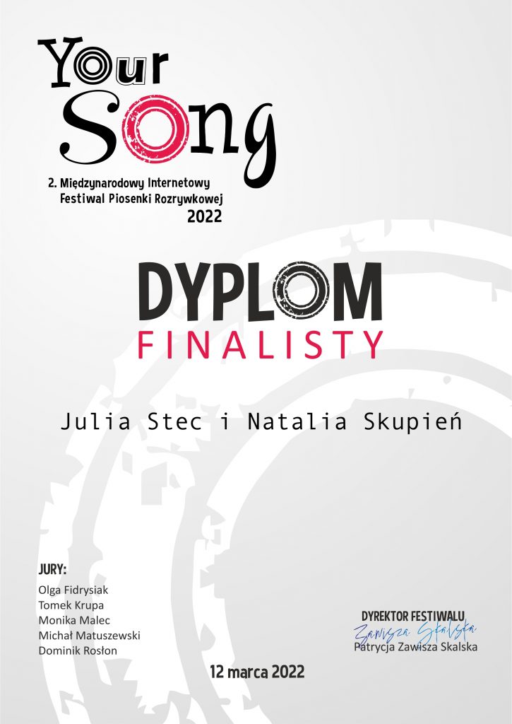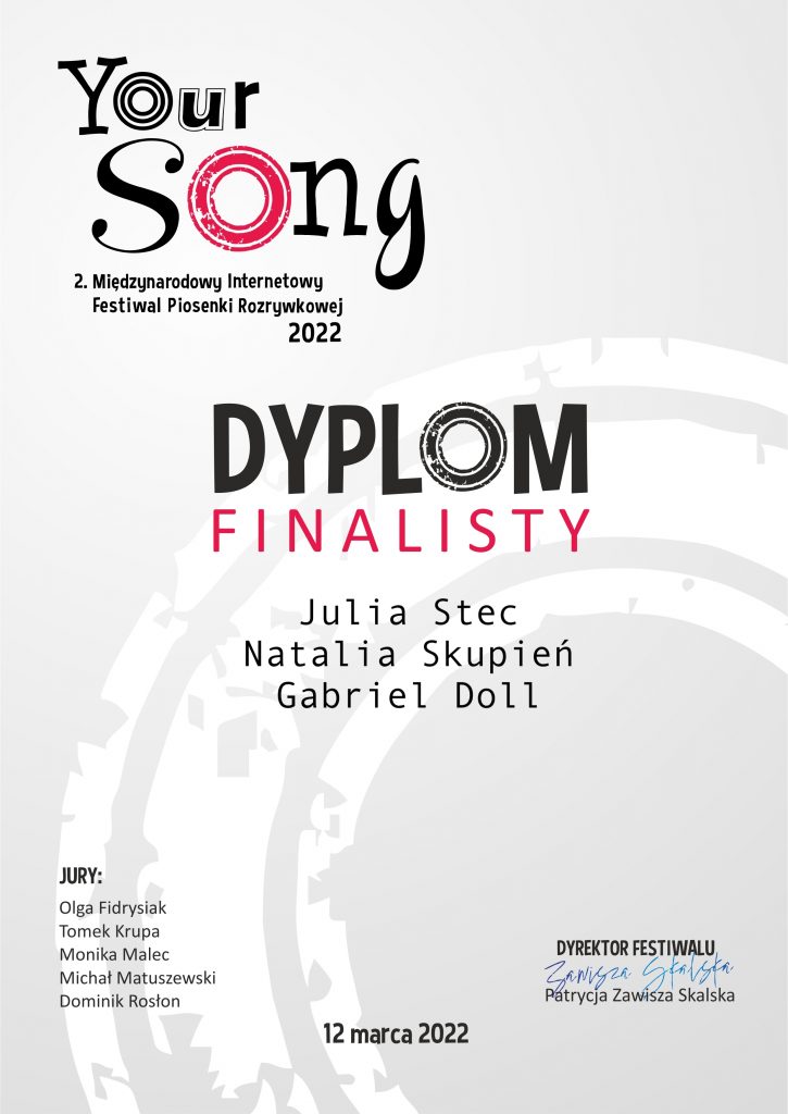 Natalia Skupień, Julia Stec, Gabriel Doll wzięli udział w 2. Międzynarodowym Internetowym Festiwalu Piosenki Rozrywkowej 2022, YOUR SONG. Na lekcjach informatyki nagrali swoje piosenki w dwóch kategoriach: Solistów oraz Zespołów wokalnych. Otrzymali dyplomy za zakwalifikowanie się do Finału konkursu. Życzymy dalszych sukcesów w rozwijaniu talentów muzycznych.