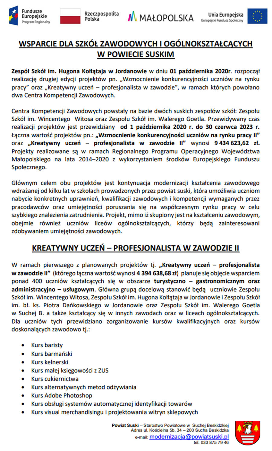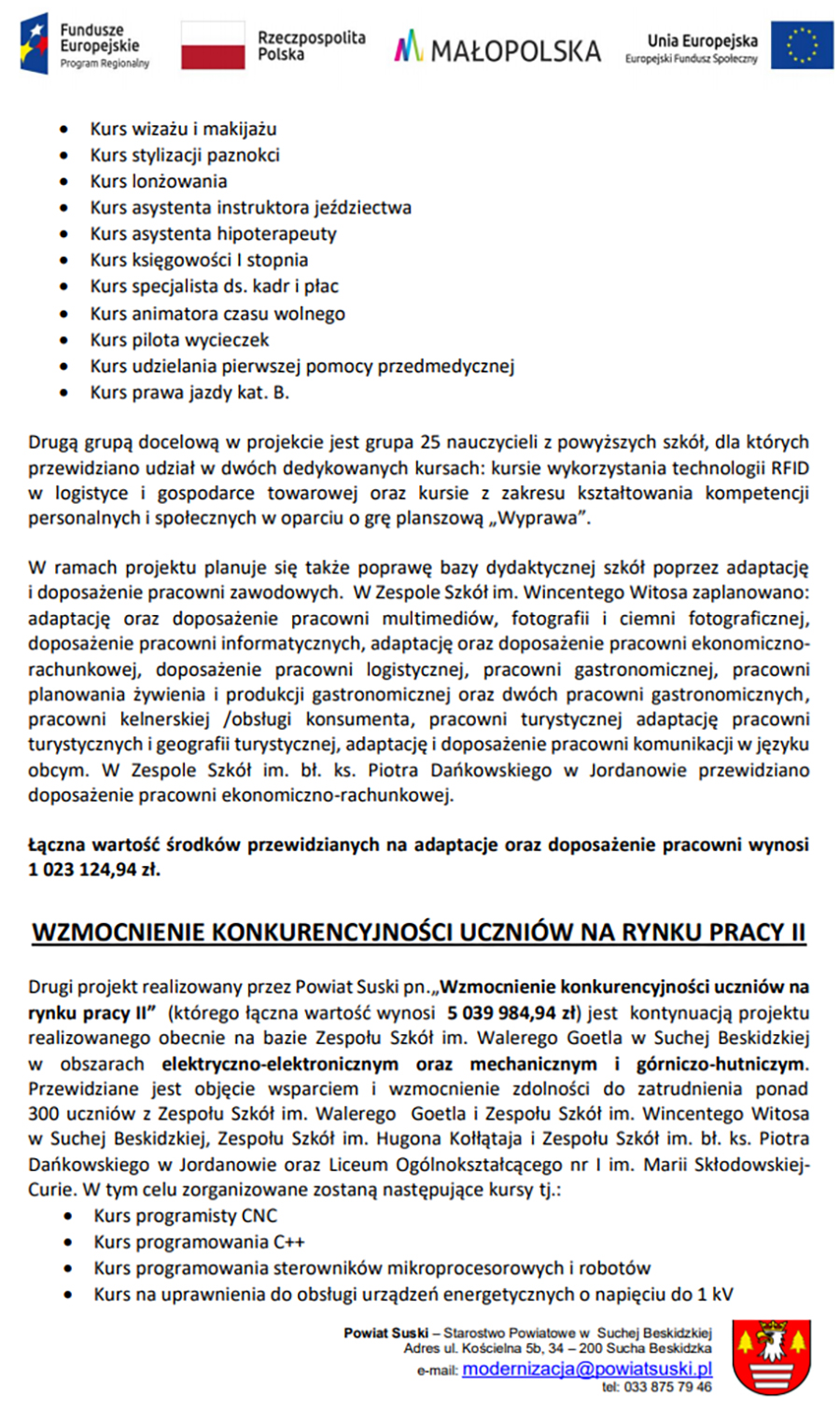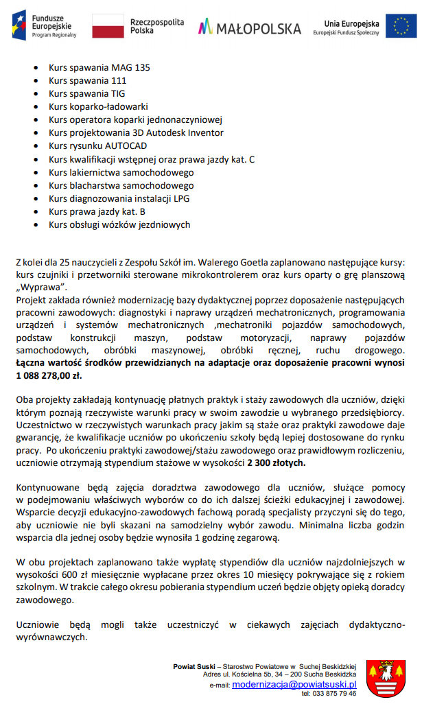 WSPARCIE DLA SZKÓŁ ZAWODOWYCH I OGÓLNOKSZTAŁCĄCYCH W POWIECIE SUSKIM