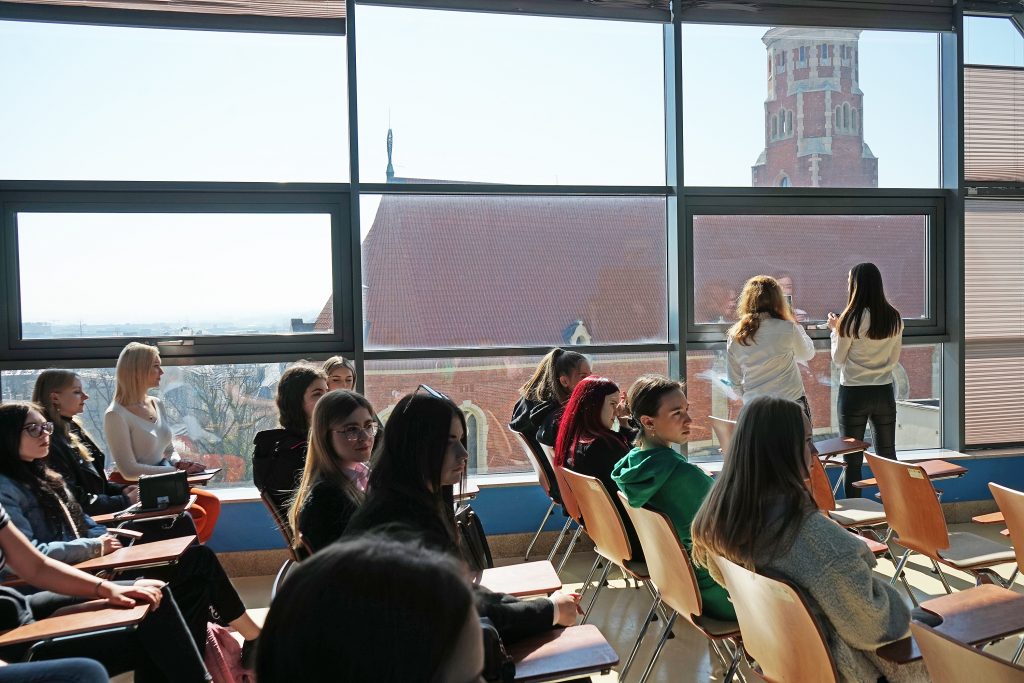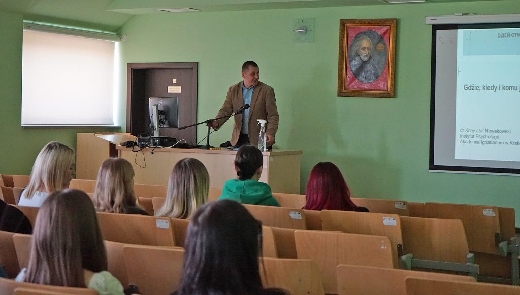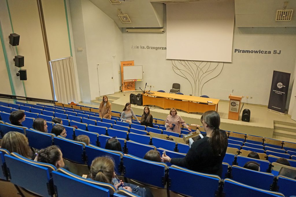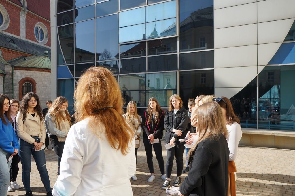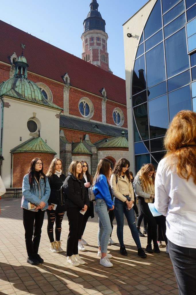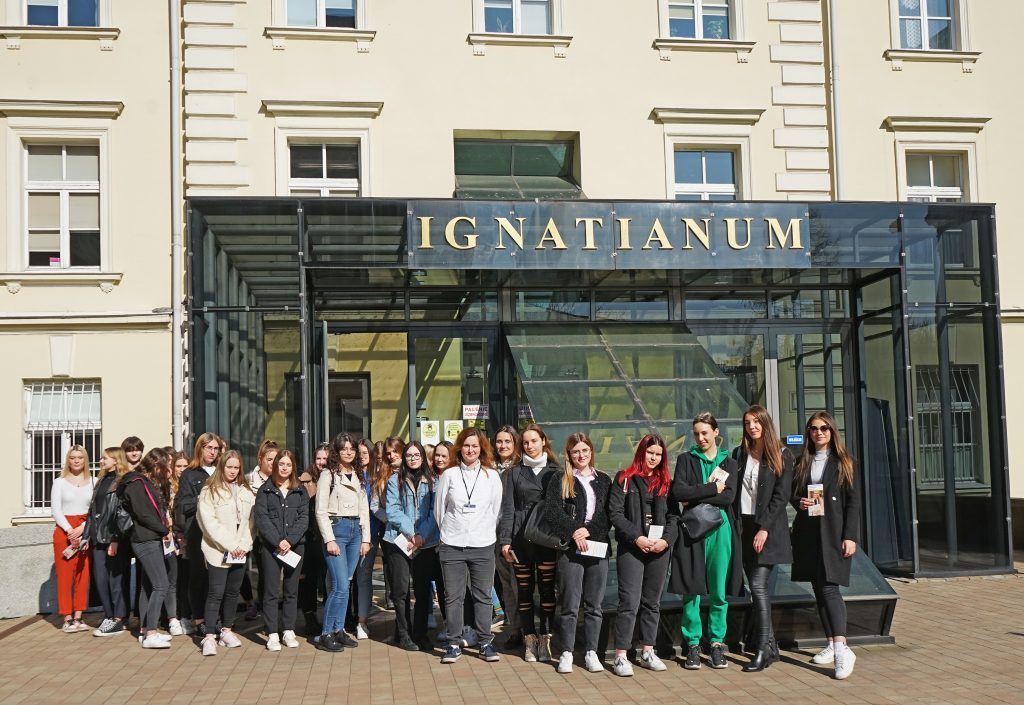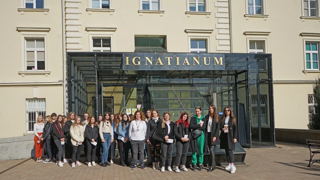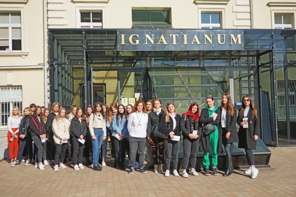 22 marca 2022 r. uczennice z klas 3ga i 3c z profilu PEDAGOGICZNO – PSYCHOLOGICZNEGO odwiedziły wyższą uczelnię Akademia Ignatianum w Krakowie. Wizyta na uczelni rozpoczęła się spotkaniem ze studentami psychologii i pedagogiki, którzy opowiedzieli o swoich kierunkach oraz o tym, dlaczego warto studiować psychologię i pedagogikę. Nasi uczniowie mieli okazję zadawania pytań oraz poznania uczelni od wewnątrz. Następnie odbył się specjalnie przygotowany dla nas wykład z psychologii, prowadzony przez dr Nowakowskiego. Wykład przybliżył naszym uczniom różne ścieżki zastosowania psychologii w pracy zawodowej. Dziękujemy za wspaniałą organizację i współpracę Paniom z Biura Promocji oraz Samorządowi Akademii Ignatianum w Krakowie. Korzystając z pięknej, wiosennej pogody wybraliśmy się jeszcze na Rynek Główny.