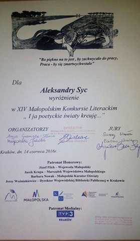Dnia 14 czerwca 2016r. uczennica klasy IIB LO Aleksandra Syc otrzymała wyróżnienia w XIV Małopolskim Konkursie Literackim „I ja poetyckie światy kreuję…”.