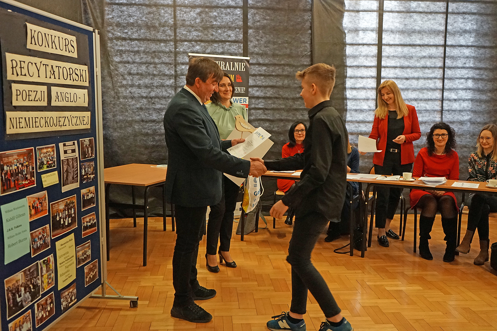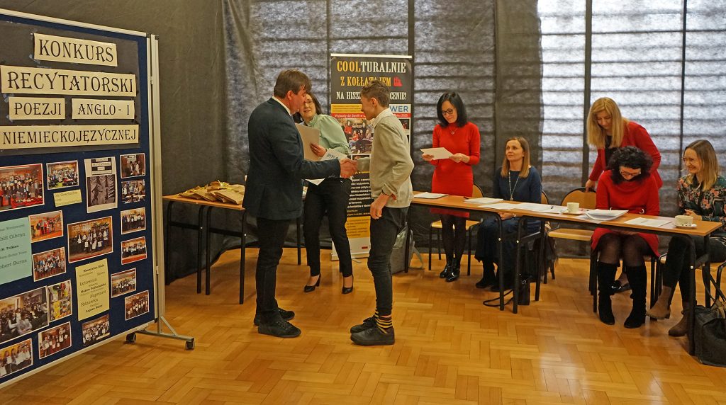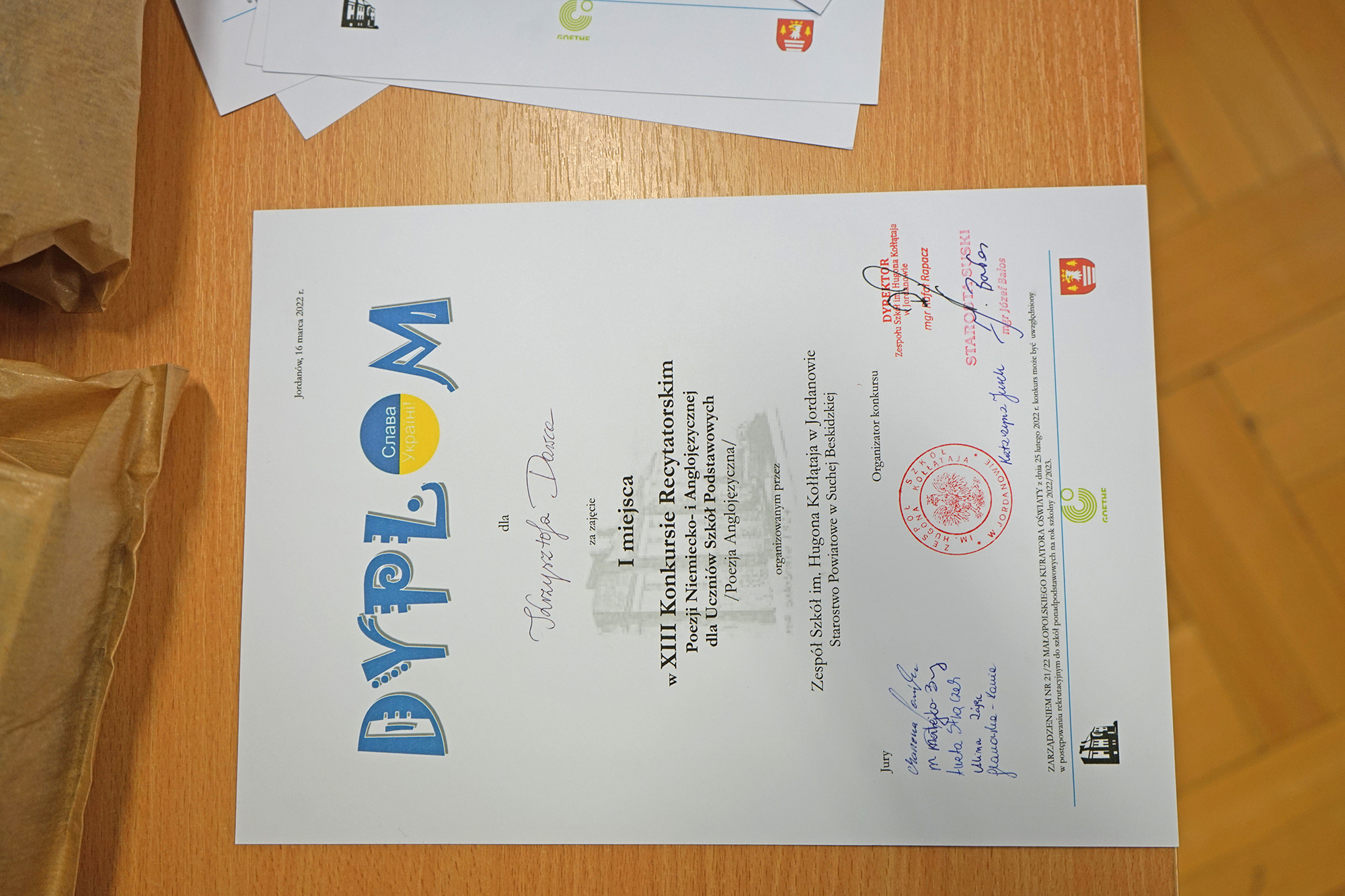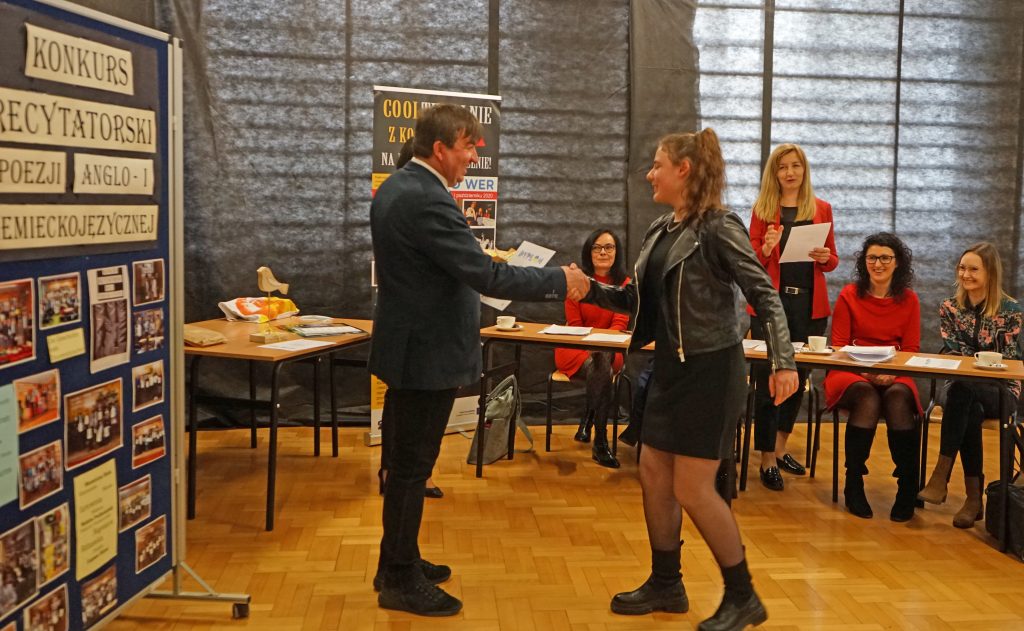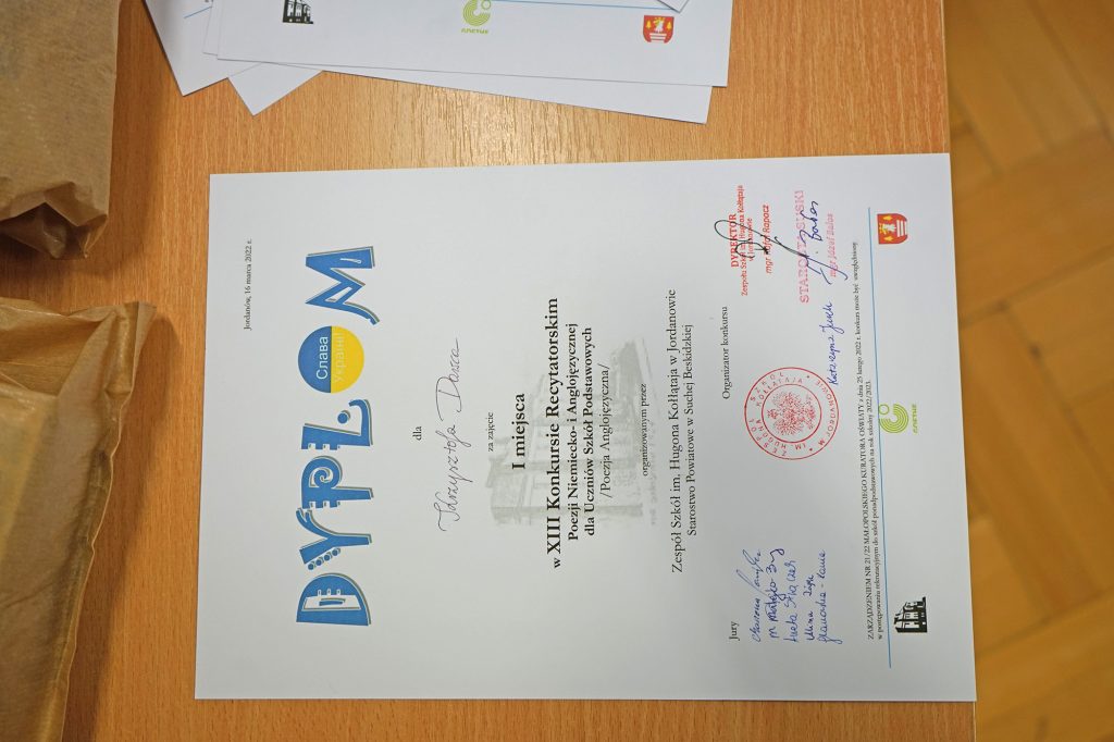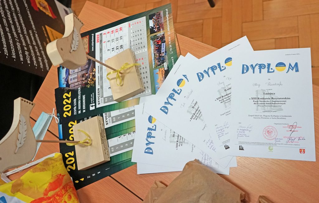 Za nami XIII Konkurs Recytatorski Poezji Niemiecko- i Anglojęzycznej dla Uczniów Szkół Podstawowych. Konkurs ma charakter otwarty. Jest organizowany przez Zespół Szkół im. H. Kołłątaja w Jordanowie i Starostwo Powiatowe w Suchej Beskidzkiej, które jest fundatorem nagród. Do konkursu zgłosiło się 58 uczniów( 22- j.niem. 56 – j. ang.) z 18 szkół podstawowych z: Jordanowa, Juszczyna, Makowa Podh. Toporzyska, Spytkowic, Naprawy, Krzczonowa, Grzechyni, Sidziny, Chabówki, Bystrej Podhalańskiej, Ponic, Rabki Zdroju (2 szkoły) Rdzawki, Skawy, Wysokiej, Łętowni.Jury w składziemgr Aneta Strączek, mgr Marzena Lańczyk , mgr Małgorzata Glanowska-Kania, mgr Magdalena Matejko-Bury, mgr Alina Zając przyznało następujące miejsca: Język niemiecki:I miejsce: Alicja Kowalczyk – Rabka-Zdrój II miejsce: Julia Wołodźko – NaprawaAnna Badyk- Chabówka,III miejsce: Mariusz Sułocha – Spytkowice Emilia Luberda – Rdzawka, Łukasz Żmuda – Rabka Zdrój